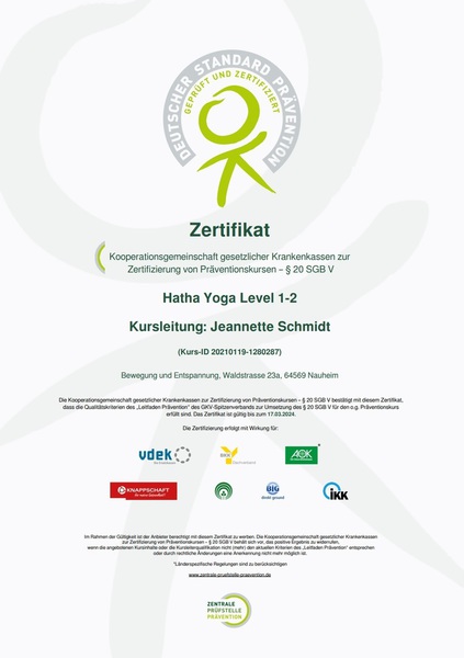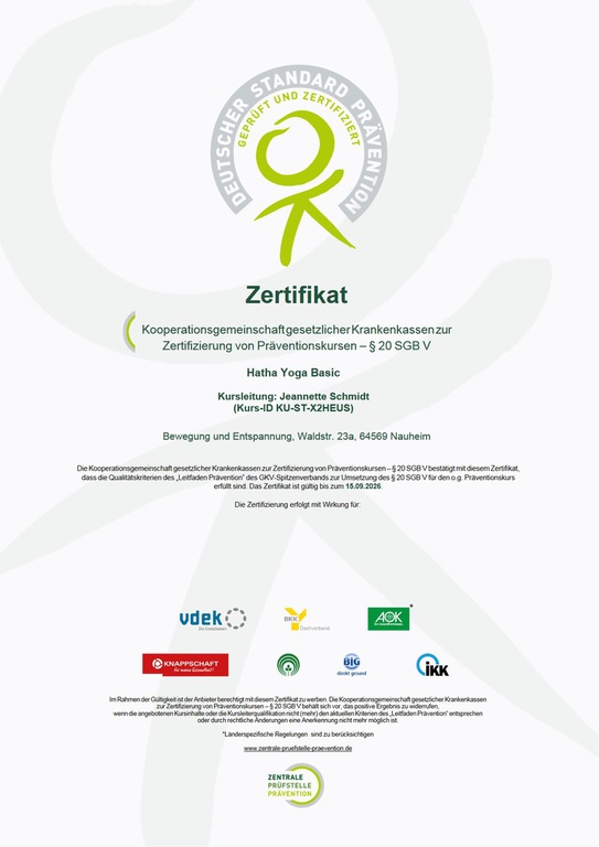 Die angebotenen Kurse Hatha Yoga Basic und Hatha Yoga Level 1-2 werden von den gesetzlichen Krankenkassen bezuschusst.